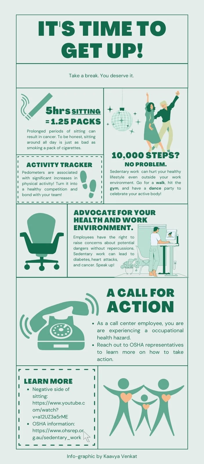 Office and administrative workers spend approximately 80,000 hours seated, and 80 percent of those who work at a computer every day suffer from shoulder pains, neck strains, eye problems, and headaches. While some large tech companies such as Apple have taken action by implementing standing desks and better work-life balance, call center employees still face this burden.